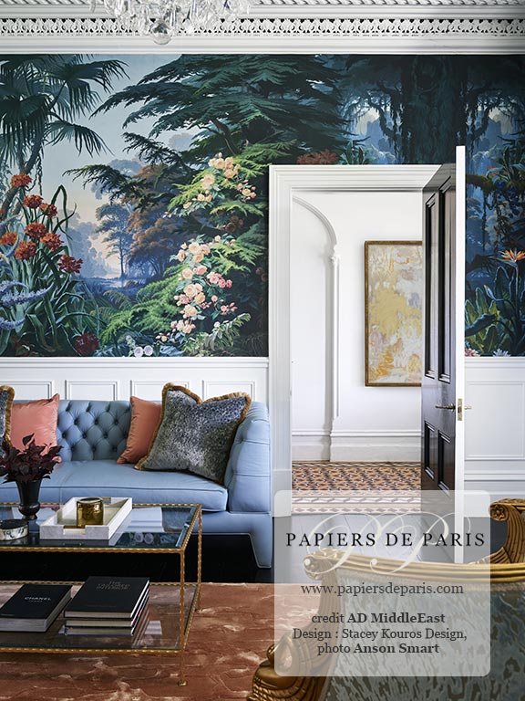 Panoramic wallpaper from the french 18th century Desfossé factory , created in 1861 and designed by Joseph Louis Fuchs . A leading with a lush exotic landscape, drilled more distant views of rivers , mountains, birds and animals.