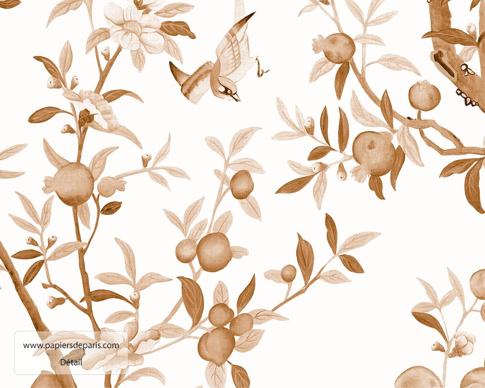 Cineserie in grisaglia - Terracotta - Carta da paratiRiferimento Chinoiserie en grisaille - Terracotta Temi : Chinoiserie Taille : 200 x 274cm Carta da parati panoramica, decorata con alberi e piante con vari fogliami e fiori, che si innalzano verso il cielo. Creata a partire da un Cineserie originale installato nell'appartamento di Pierre Bergé e Yves Saint-Laurent, questa edizione coniuga elegantemente modernità e XVIII secolo. Colore terracotta