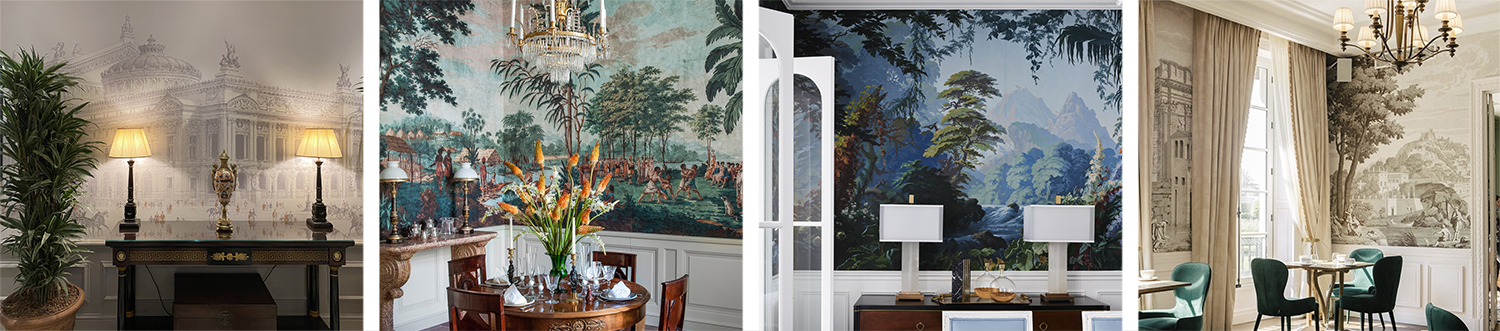 Desiderosi di poter offrire una gamma sempre più ampia di decori storici di qualità impeccabile, siamo interessati a trovare carte da parati panoramiche o decorazioni murali installate in salotti, sale da pranzo o qualsiasi altro ambiente che abbia beneficiato in passato di un'ornamentazione eccezionale. Questo approccio è spesso accompagnato dalla partecipazione alla conservazione di un decoro o alla sua documentazione in caso di scomparsa.