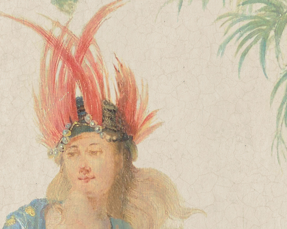 Carta da parati con motivi decorativi proveniente dal castello di Chantilly. È composta da quattro grandi pannelli che rappresentano i quattro angoli del mondo e i cinque sensi. Questi pannelli sono stati realizzati da Huet Christophe (1700-1759). Il pannello n. 4 è un'allegoria dell'America.