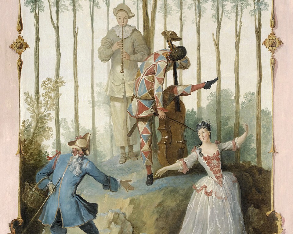 Panneau Champêtre N°2/9- Panneau décoratifRéférence CHAMPETRE2 Themes : XVIIIème Taille : 155 x 52 cm Panneau décoratif de style 18ème réalisé à partir de l'oeuvre "La Dance" de Jean-Baptiste Oudry (1686-1755) Scène : une jeune femme et un jeune homme dansant main dans la main au son de la douce mélodie de la flûte traversière et du violoncelle. A la cime des arbres, un singe acrobate fait un tour du funanbulisme. Fait partie d'une série de 9 panneaux décoratifs. Chaque panneau peut être commandé séparément