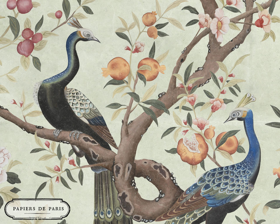 Chinoiserie 18eme - Vert d'eau - Papier peintRéférence Chinoiserie5-vert d'eau Themes : Chinoiseries Taille : 200x274cm Papier peint panoramique , décor de chinoiserie dans lequel apparaissent paons et autres oiseaux, au milieu de branchages qui montent vers le ciel. Créé à partir d'une chinoiserie originale qui fut installé dans l'appartement de Pierre Bergé et Yves Saint-Laurent. Couleur Vert d'eau Imprimé sur papier intissé - Fabriqué en France Existe en 2 formats : - H 200 X 274 cm (3 lés) - Le décor se répète après 3 lés - H 263 X 366 cm (4 lés) - Le décor se répète après 4 lés