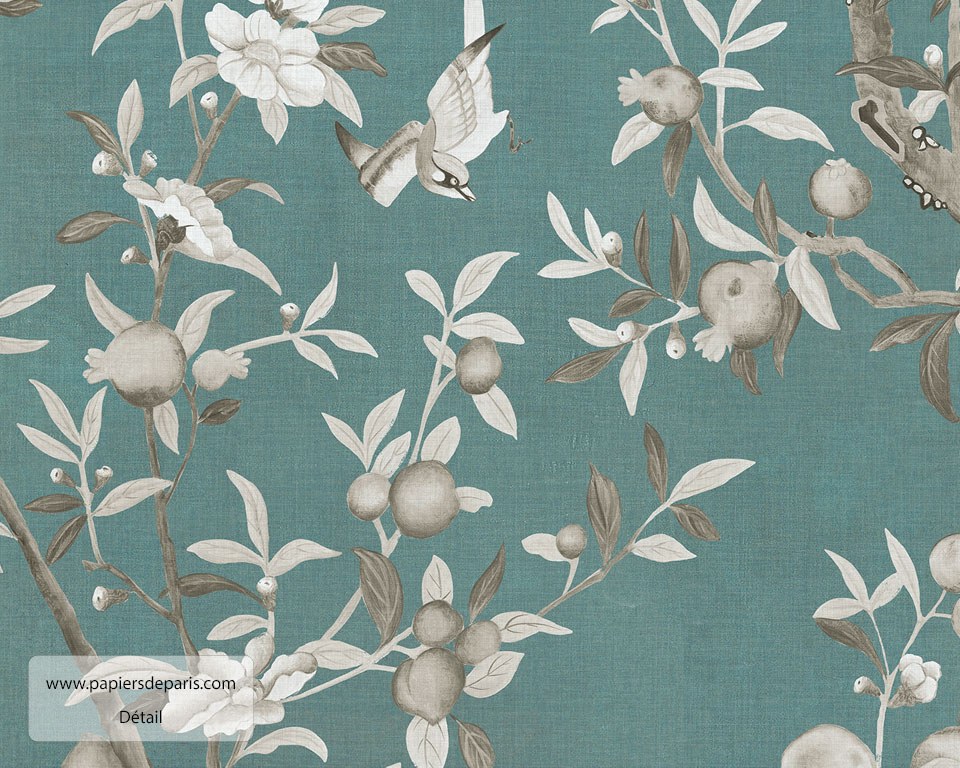 Chinoiserie en grisaille - Vert jade - Papier peintRéférence Chinoiserie en grisaille - Vert jade Themes : Chinoiseries Taille : 200x274cm Papier peint panoramique, décor d'arbres et de plantes aux feuillages et fleurs variés, montant vers le ciel. Créé à partir d'une chinoiserie originale qui fut installé dans l'appartement de Pierre Bergé et Yves Saint-Laurent, cette édition allie modernité et 18ème siècle avec élégance. Imprimé sur papier intissé - Fabriqué en France Existe en 2 formats : - H 200 X 274 cm (3 lés) - Le décor se répète après 3 lés - H 263 X 366 cm (4 lés) - Le décor se répète après 4 lés