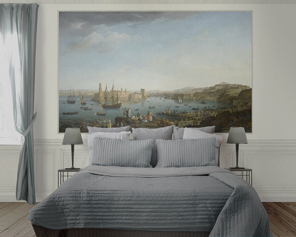 Le Port de Marseille - Papier peintRéférence Marseille Themes : XVIIIème Taille : 170 x 274,2 cm Papier peint panoramique réalisé d'après l'oeuvre de Joseph Vernet(1714-1789), peintre et graveur : "L'entrée du port de Marseille" Un marine exceptionnelle du 18e siècle représentant quelques barques, bateaux à voile et personnage devant le port de Marseille et sous un ciel très Dimensions originale: 165 x 263 cm Dimension du décor: H170x L274,2cm - livré en 3 lés de 91,4cm Papier intissé mat - Fabriqué en France