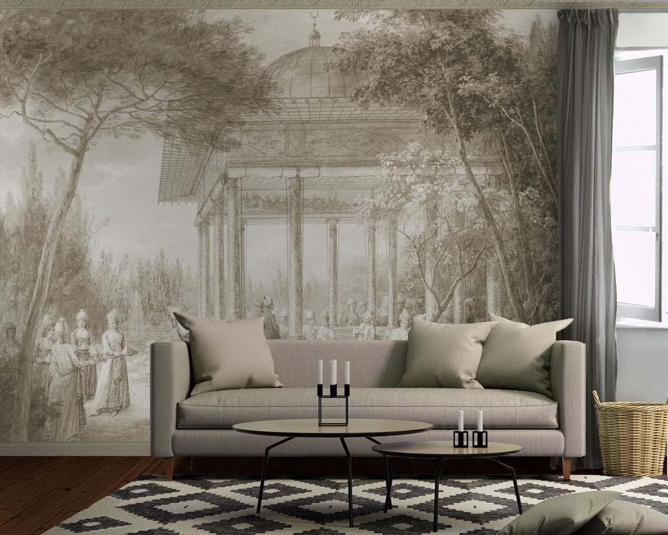 Décor panoramique oriental réalisé à partir de l'oeuvre de Jean-Baptiste Hilaire (1753-après 1822), peintre : "Goûter oriental dans un pavillon, dans un parc" à l' encre brune et aquarelle et gouache Papier intissé - Imprimé en France Dimensions H250 x L 328cm, livré en 4 lés