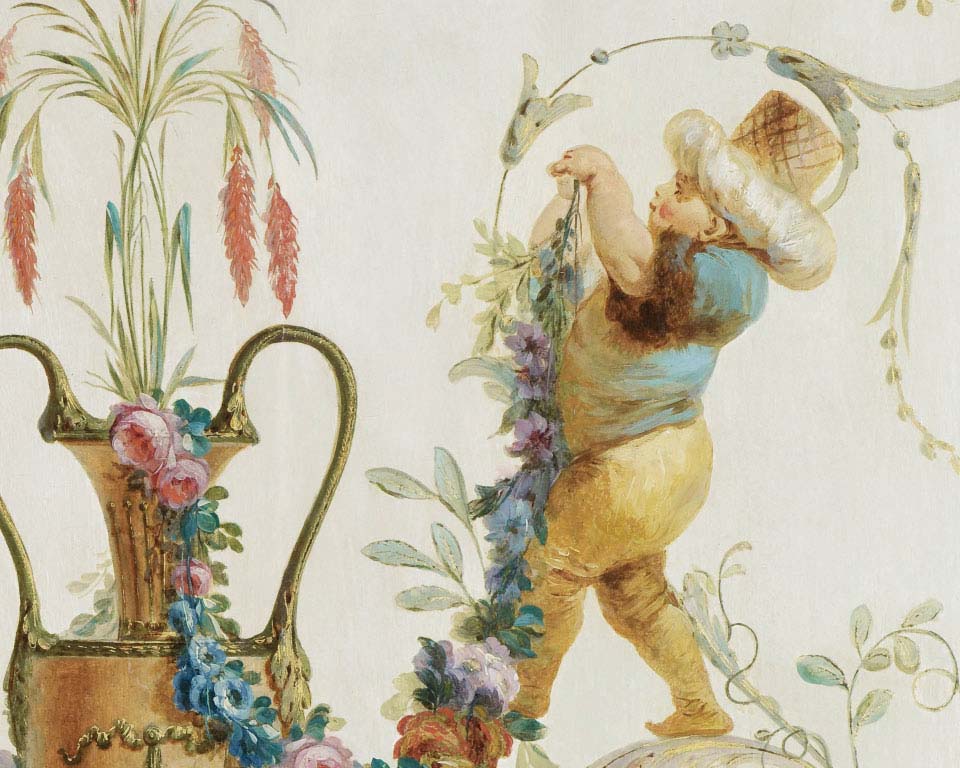Vases&Genies N°2/6 - Panneau décoratifRéférence GENIES2 Themes : XVIIIème Taille : 114 x 91,4cm Papier peint décoratif "grotesque" créé à partir de l'oeuvre "Génies, guirlande de fleurs, vase" de Jean Simeon Rousseau (1747-1820) Ensemble de six panneaux de boiserie, chacun étant diposnible sur demande. Provenance : cabinet turc du comte d'Artois (château de Versailles) Chaque panneau peut être commandé séparement